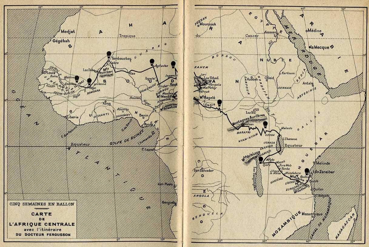 TENTER de traverser l’Afrique d’est en ouest par la voie des airs, prétendre survoler dans sa plus grande largeur le dangereux continent noir à bord d’une fragile nacelle livrée à tous les caprices des vents, c’était, au temps de Jules Verne, une entreprise d’une audace incroyable. Comme on peut s’y attendre, les cinq semaines qu’il faudra au fdocteur Fergusson et à ses deux compagnons pour y parvenir seront pleines d’imprévu et de péripéties.