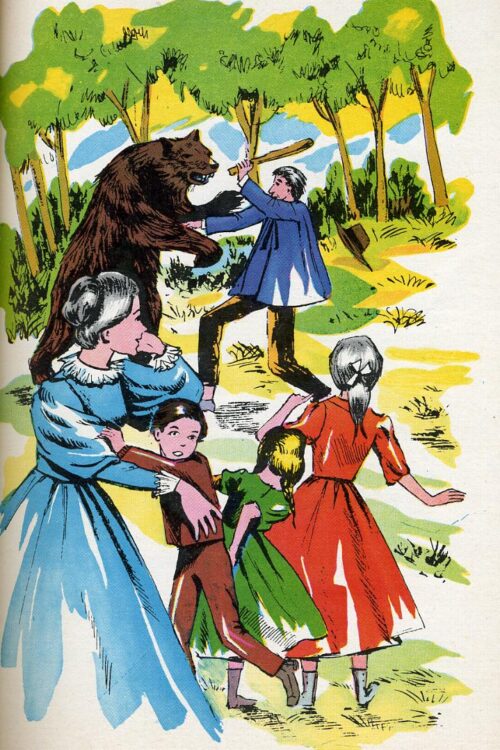 Ils se remirent en route, n’osant plus parler, regardant à droite et à gauche, s’attendant sans cesse à voir sortir l’ours de derrière un buisson