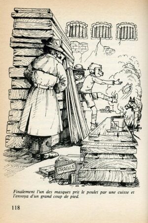 Finalement l’un des masques prit le poulet par une cuisse et l’envoya d’un grand coup de pied. p. 118