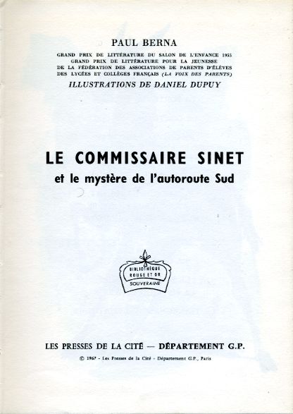 LE COMMISAIRE SINET et le mystère de l’autoroute Sud, by Paul BERNA LES PRESSES DE LA CITÉ – DÉPARTEMENT G.P. Bibliothèque Rouge et Or Souveraine