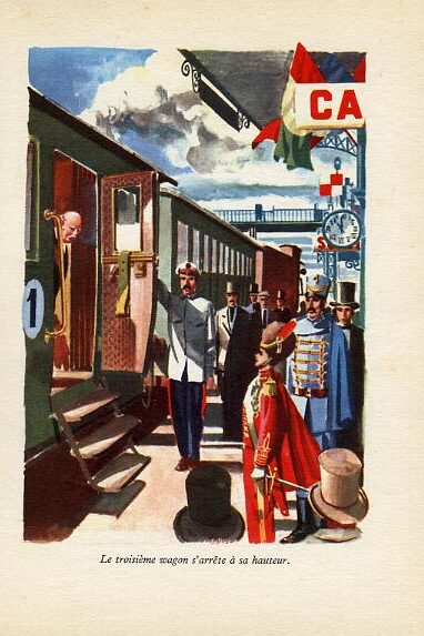 A peine descendu de wagon, il s’avança vers Michel, le visage souriant. Plusieurs autres messieurs le suivent. Michel fait deux pas à sa rencontre et pose sa petite main dans la large paume gantée de blanc. Quand le président a cessé de la secouer et de lui souhaiter la bienvenue, il récite bien correctement :