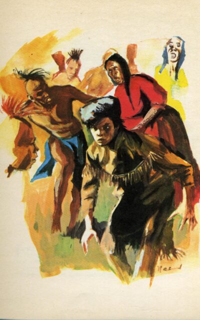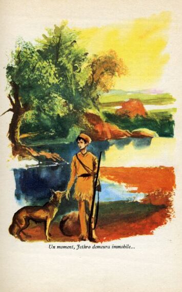 Qui avait campé là? Des Blancs ou des Indiens? Rien ne l’indiquait. Accroupi, le regard tendu, Jethro se mit à examiner l’herbe brûlée. Il y avait sur le sol une empreinte de talon. Etait-ce le talon dur d’une botte française? Qui eût pu le discerner? Un peu plus tard, comme il puisait de l’eau à la source, il aperçut un morceau de frange finement découpée dans de la peau d’élan d’un brun rougeâtre. Ce morceau de frange était enfoncé dans la terre humide et presque entièrement caché par les fougères. Etait-ce la frange d’une veste d’Indien? Jethro n’en savait rien. Mais une chose du moins ne faisait plus de doute : c’étaient les hommes qui étaient passés près de la maison du grand-père dix jours auparavant qui avaient campé là, et, indubitablement, ils s’étaient servis du canoë du grand-père pour traverser l’étang.