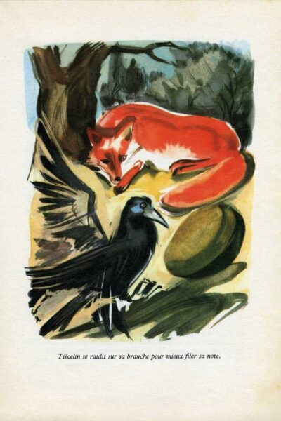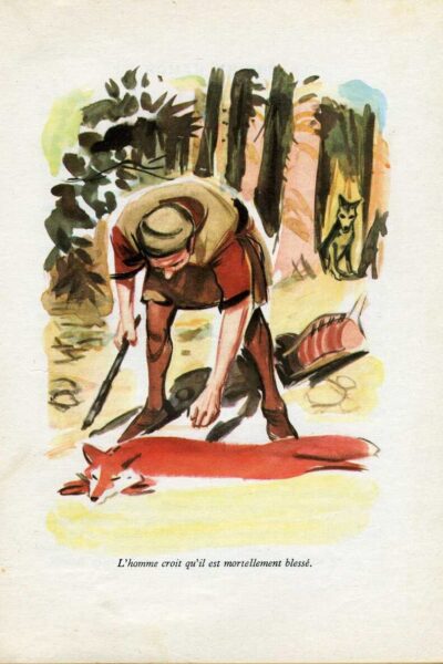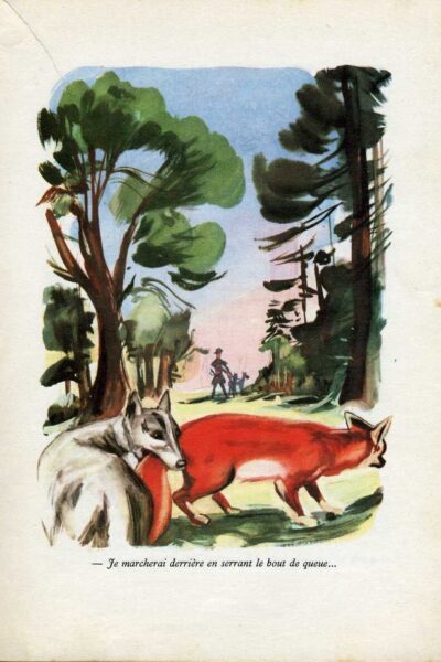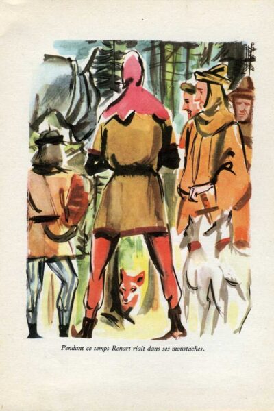 Ysengrin bien en place, la corde tenant à sa queue et le seau tenant la corde, Renart va se blottir sous un buisson de la rive, le museau entre les pattes, pour ne rien perdre d’un si beau spectacle. Au bout d’un instant :