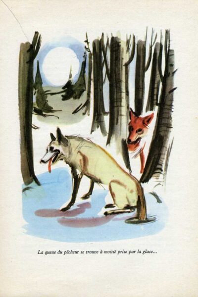 – Venez m’aider, frère Renart! supplie Ysengrin. J’ai pris tant de poissons que je ne puis dégager ma queue. Je tire, je tire et ne fais que me déchirer la peau du derrière…