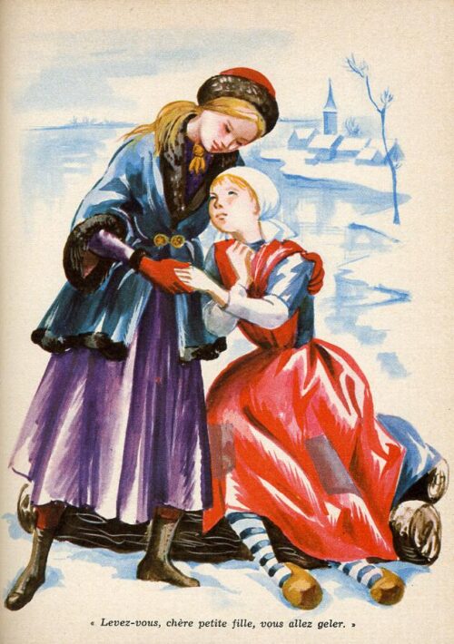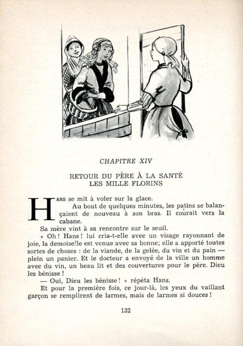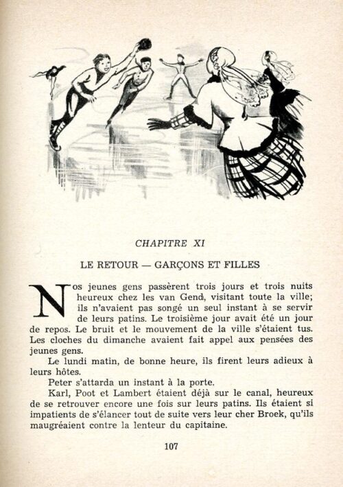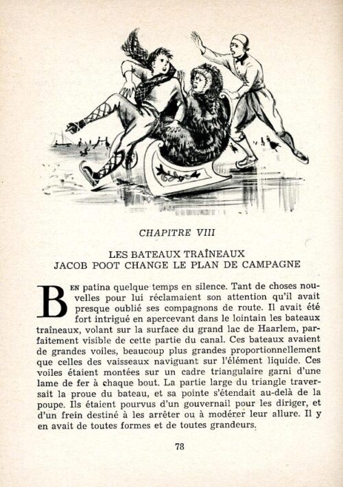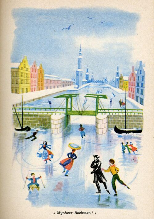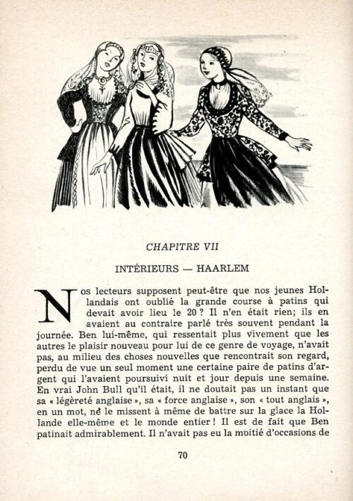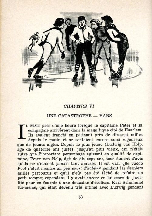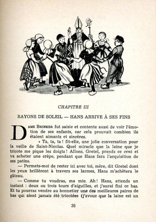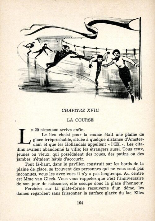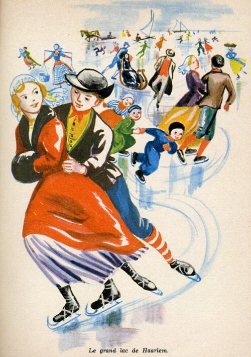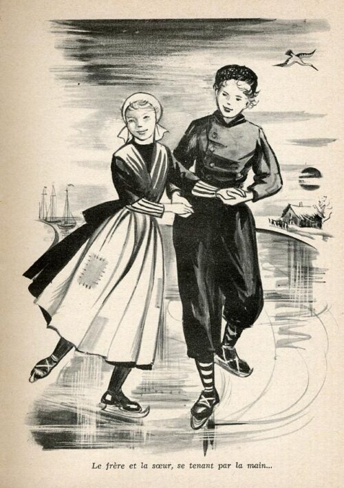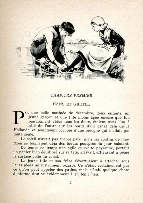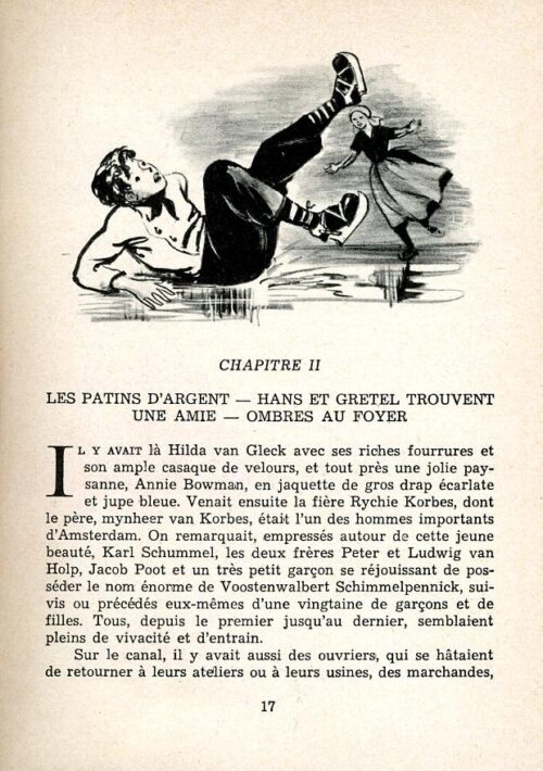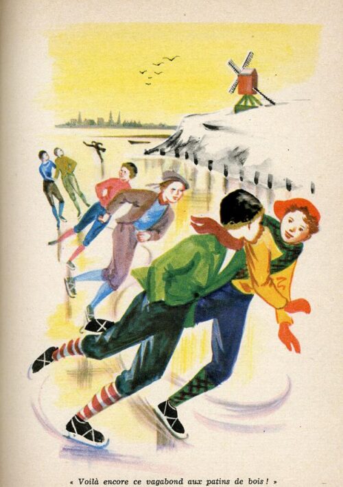 E N HOLLANDE, pendant les mois d’hiver, les canaux pris sous la glace transforment le pays en une immense patinoire. Tous alors ne rêvent plus que de patins… Les plus pauvres s’en fabriquent en bois, les plus fortunés en possèdent d’élégants, à boules dorées et à clochettes, mais il est aussi des patins d’argent… et ceux-là ne seront donnés qu’au plus méritant.