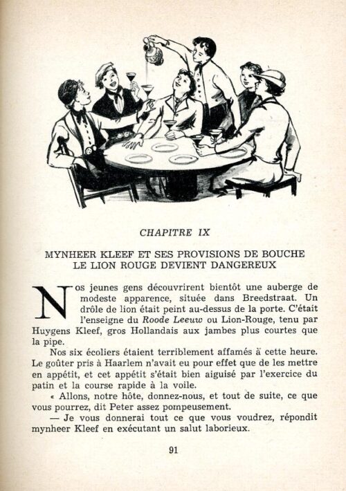 IL ÉTAIT près d’une heure lorsque le capitaine Peter et sa compagnie arrivèrent dans la magnifique cité de Haarlem. Ils avaient franchi en patinant près de dix-sept milles depuis le matin et se sentaient encore aussi vigoureux que de jeunes aigles. Depuis le plus jeune (Ludwig van Holp, âgé de quatorze ans juste), jusqu’au plus vieux, qui n’était autre que l’important personnage agissant en qualité de capitaine, Peter van Holp, âgé de dix-sept ans, tous étaient d’avis qu’ils ne s’étaient jamais tant amusés. Il est vrai que Jacob Poot s’était montré un peu court d’haleine pendant les derniers milles parcourus et qu’il n’eût pas été fâché de refaire un petit somme; cependant il y avait encore en lui assez de jovialité pour en fournir à une douzaine d’écoliers. Karl Schummel lui-même, qui était devenu très intime avec Ludwig pendant la route, en oubliait d’être désagréable. Quant à Peter, il était le plus heureux d’entre les heureux. Il avait chanté et sifflé si joyeusement tout en patinant, que les passants les plus graves n’avaient pu s’empêcher de sourire en l’écoutant.