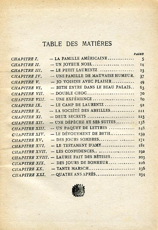 Jo était très occupée dans son grenier. Les jours d’octobre commençaient à devenir froids, et les après-midi étaient courtes. Pendant deux ou trois jours, le soleil brillant éclaira Jo assise sur le vieux sofa et écrivant fiévreusement dans ses cahiers étalés devant elle, pendant que Raton, son singulier favori, accompagné de son fils aîné, un beau jeune homme qui était évidemment très fier de ses naissantes moustaches, se promenait dans les haricots Jo, très absorbée par son œuvre, arriva enfin à sa dernière page. Ce fut avec une satisfaction très grande qu’elle traça au bas, en plus gros caractères, ce joli mot « FIN », que les auteurs aiment tant à écrire, et son nom orné d’un paraphe gigantesque.