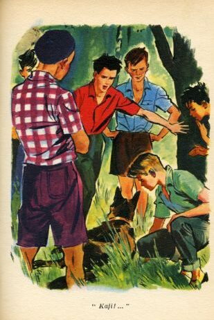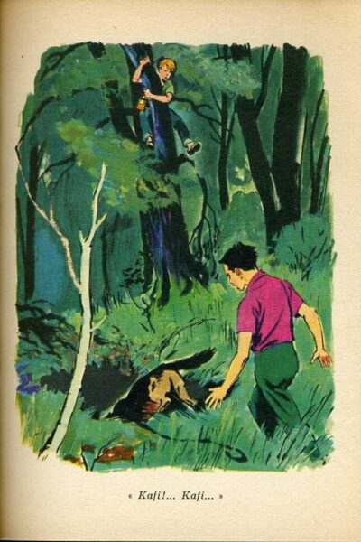 Dans mon affolement, je retrouve à grand-peine mon chemin. Soudain, au loin, sur ma droite, un coup de sifflet! Mon cœur se remet à battre. Kafi a été retrouvé! Je me précipite à travers les buissons épineux sans me soucier des égratignures. Mes camarades font cercle autour de quelque chose. Je les écarte.