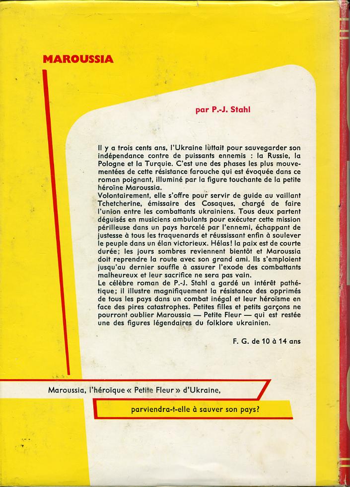 Le célèbre roman de P.-J. Stahl a gardé un intérêt pathétique; il illustre magnifiquement la résistance des opprimés de tous les pays dans un combat inégal et leur héroïsme en face des pires catastrophes. Petites filles et petits garçons ne pourront oublier Maroussia, – Petite Fleur – qui est restée une des figures légendaires du folklore ukrainien.