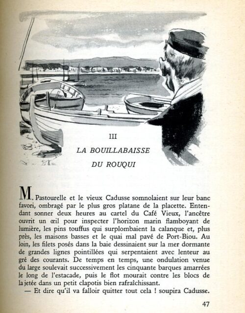 La meute, riant aux larmes, arriva devant le plan incliné de la cale. Le Rouqui était bien là, caché dans l’ombre d’une grosse barque qui reposait sur son chantier; il regardait avec intérêt les hommes du bord gratter la coque matelassée de varechs. L’arrivée de la meute le laissa froid. Charloun lui lança deux petits coups de trompe en guise de semonce, puis :