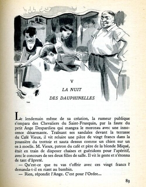 Les turbulents gamins de Port-Biou sont d’une folle audace, et la « quête » qu’ils entreprennent en secret n’est pas sans noblesse. Ils se sont jurés de gagner un million en deux mois pour sauver leurs vieux amis du village, qu’on a menacés d’expropriation! Chacun y met du sien et, bientôt grâce à leur ingéniosité, à leur esprit de sacrifice, à l’utilisation intelligente de leurs dons personnels, cet effort de solidarité donne des résultats surprenants : leur chère cagnotte, qu’ils ont surnommée le Saint-Frusquin, s’arrondit peu à peu jusqu’à former un total impressionnant. Mais les jours filent très vite et le chiffre faditique est loin d’être atteint. A vingt-quatre heures de l’échéance, il manque encore 200.000 francs. Où et comment les trouver? Est-ce qu’on ne peut pas compter sur un petit miracle, quand on s’est déjà donné tant de mal pour une si belle cause?