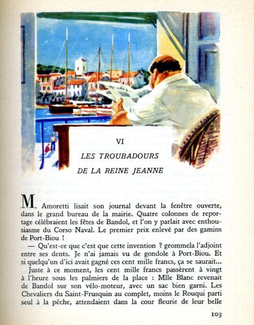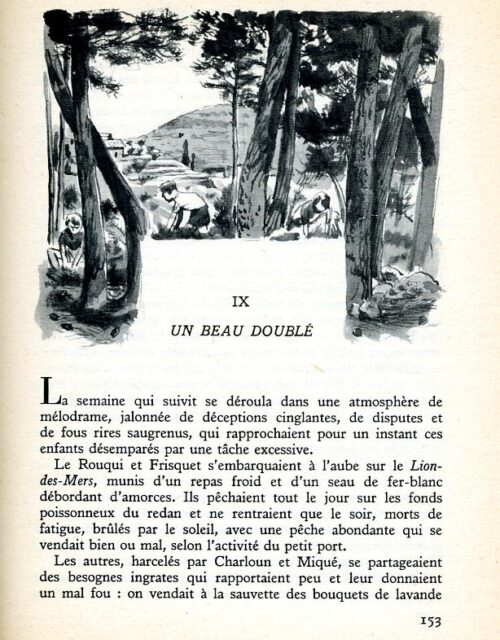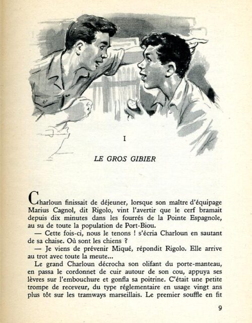 Coucoulin et sa sœur Rosette, petits-enfants du notaire de Port-Biou, habitaient dans le haut village une villa neuve qui abritait les bureaux de l’étude. Malgré le vent déchaîné qui faisait un bruit de ressac dans les pins de la colline, ils entendirent nettement les appels du cerf et les généreux coups de trompe distribués dans les ruelles du port. La folie de Charloun était contagieuse, aucun de ses fidèles n’avait jamais regretté de se compromettre avec lui dans les pires mésaventures. Le mince Coucoulin – ses amis prononçaient : Coucoulîne, à la provençale – referma doucement son album de timbres, cligna de l’œil à Rosette et se glissa à pas de loup jusqu’au coin de la pergola. Ce n’était qu’un jeu d’éluder les avis bêlants de la mamette, les recommandations sourcilleuses de Maître Cabassole, mais il leur fallait tromper la surveillance hypocrite de M. Toussaint, le premier clerc, qui se donnait abusivement des droits sur les enfants de la maison.
