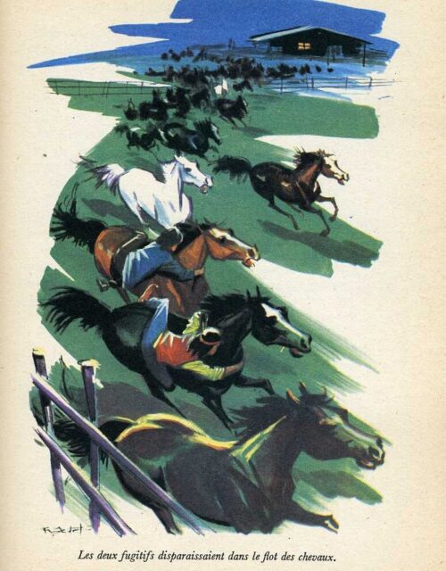 Les deux fugitifs disparaissaient dans le flot des chevaux.   p. 141